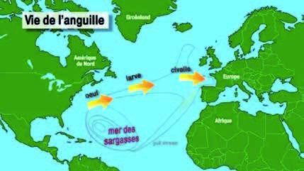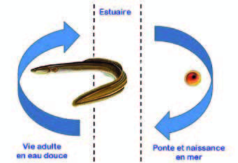 Les anguilles d’Europe naissent donc dans l’eau de mer, migrent une première fois pour passer la plus grande partie de leur vie en eau douce puis migrent à nouveau pour se reproduire en eau de mer.