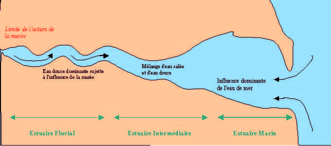 Le mélange entre l’eau douce et l’eau de mer ne se fait pas en un endroit précis et la salinité n’augmente que progressivement à travers l’estuaire fluvial, l’estuaire intermédiaire et l’estuaire marin enfin.