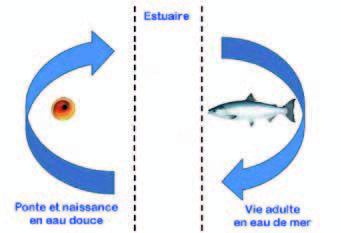 Les saumons atlantiques fonctionnent donc à l’inverse des anguilles : ils naissent dans l’eau douce, ils migrent une première fois pour passer la plus grande partie de leur vie en mer puis migrent à nouveau pour se reproduire en eau douce.