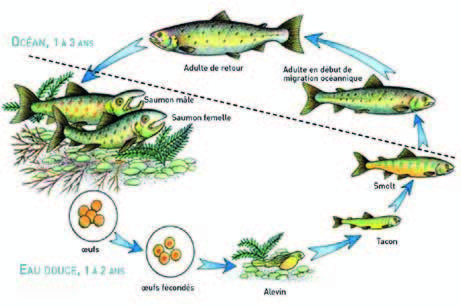 Les œufs de saumon sont pondus à l’automne dans une rivière bien oxygénée. Ils éclosent en avril. Après 2 ou 3 ans en rivière, les jeunes saumons, qu’on appelle tacons à ce moment, mesurent environ 15 cm et s’apprêtent à partir en mer. Après une crue printanière, ils dévalent la rivière et entreprennent leur migration vers la mer. Ce déplacement les mènera jusqu’au Groenland ou en Mer de Norvège.