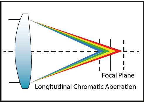 La couleur de la lumière est déterminée par sa longueur d’onde. Étant donné que les différentes longueurs d’onde circulent à des vitesses différentes lorsqu’elles traversent une lentille, on observe un phénomène appelé dispersion. Par conséquent, les points focaux des différentes couleurs ne tombent pas tous exactement sur le même plan focal. Ces aberrations peuvent déformer la couleur dans les images capturées et provoquer l’apparition de franges chromatiques indésirables à la limite entre les zones claires et foncées de l’image.
